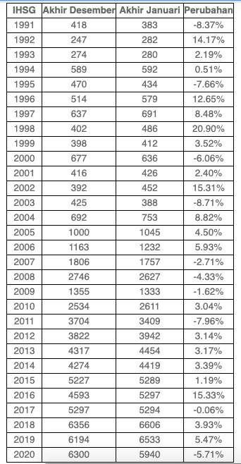 Data di atas menunjukkan dalam 30 tahun terakhir (1991-2020), IHSG lebih banyak naik daripada turun sepanjang Januari (dihitung dari akhir Desember hingga akhir Januari). IHSG Januari turun pada 1991, 1995, 2000, 2003, 2007, 2008, 2011, 2017 dan 2020.