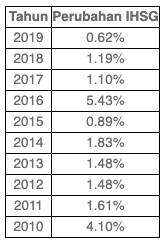 Mari kita simak data perubahan IHSG dalam 10 tahun terakhir. Data perubahan dihitung selama tujuh hari perdagangan yang terdiri lima hari terakhir di Desember dan dua hari pertama di Januari: