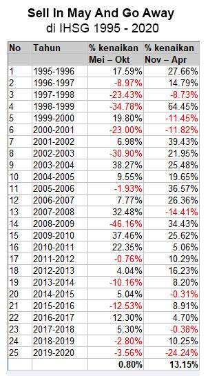Secara umum dari data statistik dapat dikatakan bahwa ungkapan Sell In May And Go Away benar-benar terjadi di IHSG. Dalam kurun waktu 1995-2020 (25 tahun), tingkat kenaikan rata-rata IHSG di bulan Mei – Oktober hanya 0,80%, sedangkan di bulan November – April mencapai 13,15%. Perbedaan yang sangat signifikan.