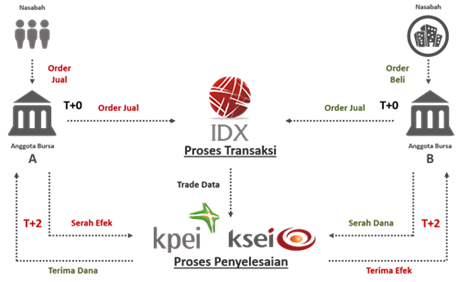 Untuk memahami proses transaksi saham, pertama-tama kamu harus mencermati bahwa jual/beli saham tidak dilakukan secara tatap muka antara pembeli dan penjual. Penjual dan pembeli tidak langsung bertukar saham dan uang seperti proses jual/beli di supermarket. Transaksi jual/beli saham dilaksanakan secara elektronik melalui perantaraan beberapa pihak, termasuk perusahaan sekuritas sebagai Anggota Bursa, Bursa Efek Indonesia (IDX), KPEI dan KSEI; sedangkan dana nasabah disimpan dalam rekening khusus di bank kustodian.