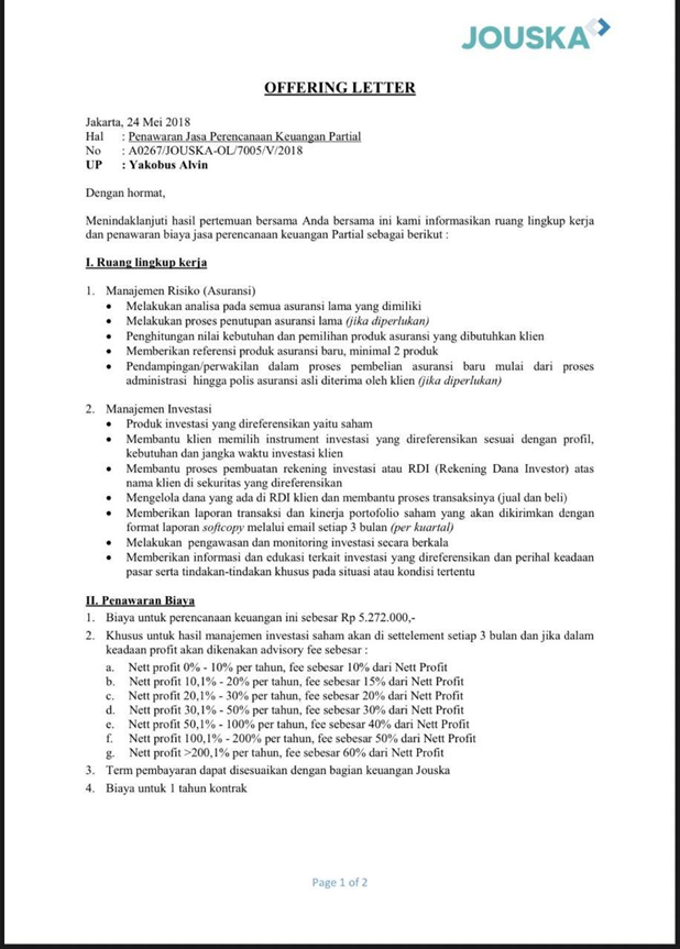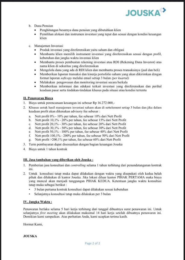 Dari offering letter di atas kamu bisa lihat bahwa janji profit yang diberikan oleh Jouska tidak main-main, bahkan hingga 200% per tahun. Fee yang dikenakan pun apabila profit sangatlah besar, namun jika nasabah merugi tidak ada keterangannya. Belum lagi biaya perencanaan keuangannya sebesar Rp5.272.000 di luar fee kelola.