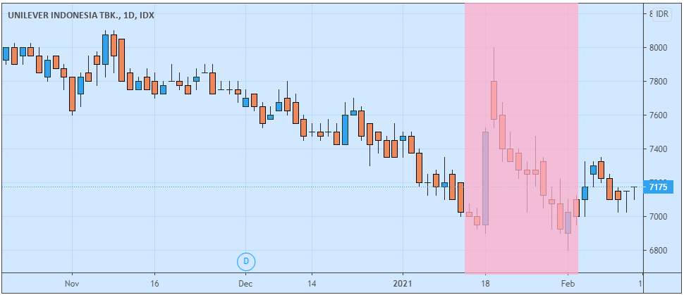 Apa yang terjadi setelah itu? Harga saham UNVR tumbang lagi dan terperosok masuk ke bawah Rp6.925 pada awal Februari. Jungkat-jungkit ini hanya memakan waktu dua pekan.