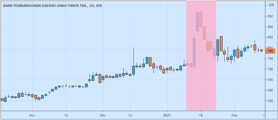 Contoh lain ketika saham BJTM meroket dari kisaran Rp700 per lembar hingga mencapai Rp970 dalam tempo tiga hari di pertengahan Januari 2021 juga. Kenaikan harga saham BJTM saat itu berkaitan dengan pom-pom oleh seorang influencer, kemudian semakin parah lantaran sikap FOMO trader dan investor.