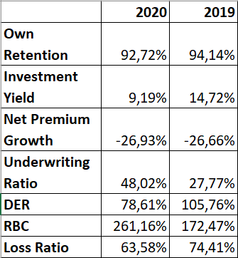 Selama ini, bukan hanya di tahun 2020 saja, emiten memiliki rasio kerugian yang besarnya hingga 50-70% jauh di atas angka maksimal yang ditetapkan. Dengan jumlah premi yang terus menurun diimbangi dengan loss ratio yang terus meningkat menandakan bahwa emiten telah berupaya memberikan kemudahan seleksi nasabah namun tetap tidak mampu menarik lebih banyak premi yang masuk.