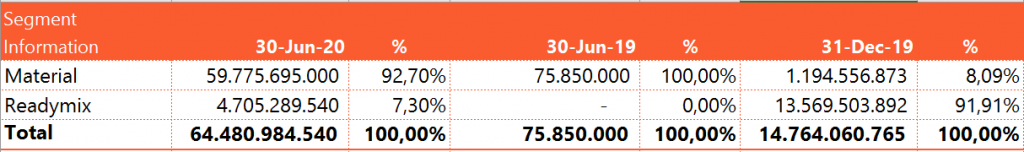 Sedangkan per Juni 2020 segmen usaha material adalah kontributor pendapatan terbesar. Kemungkinan besar segmen readymix akan menghasilkan paling besar di kuartal III dan IV setiap tahunnya seperti emiten precast dan readymix lain seperti WTON dan WSBP, sehingga pendapatan emiten belum dapat terkira di tahun 2020.
