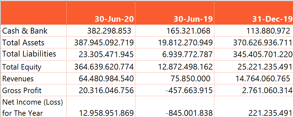 Pendapatan sendiri naik banyak dari Rp 75,85 juta saja di Juni 2019 menjadi Rp64,48 miliar per Juni 2020. Per tahun buku 2019 emiten berhasil membukukan pendapatan sebesar Rp 64,48 miliar.