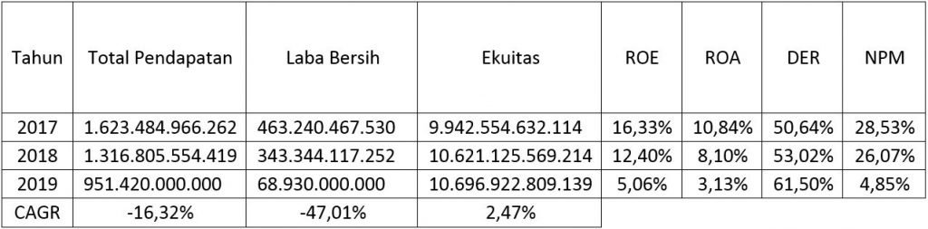 Penurunan laba bersih lebih nyata lagi terasa dengan kecepatan pelemahan sebesar rata-rata 47 persen setiap tahunnya turun dari Rp 463,24 miliar di tahun 2017 menjadi hanya Rp 68,9 miliar di tahun 2019.
