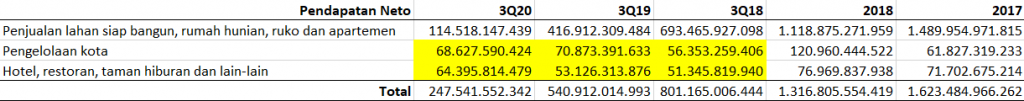 Pendapatan berulang, selain dari jasa pengelolaan kota, nilainya stabil berkisar Rp 70-an miliar setiap tahunnya. Nilai pendapatan yang datang dari jasa pengelolaan kota juga baik, naik turun di kisaran Rp 60-120 miliar setiap tahunnya.