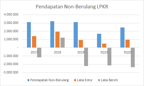 Data di atas disajikan dalam jutaan rupiah. Tahun 2020 adalah tahun yang unik bagi LPKR karena kalau biasanya emiten lain pendapatan non-berulang yang terdiri dari penjualan properti mengecil selama pandemi, pendapatan non-berulang LPKR malah naik.