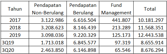 Peroleh dari Fund Management juga mengecil namun marjin labanya tetap gemuk, sejauh ini hanya segmen ini saja yang pengelolaan efisiensi bebannya berjalan dengan baik. Sayangnya pendapatan yang datang dari segmen ini terus mengecil sejak 2017.
