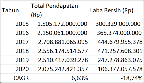 Pertumbuhan rata-rata tahunan (CAGR) pendapatan sejak 2015 adalah 6,63 persen. Sedangkan CAGR laba bersih sejak 2015 minus 18,74 persen per tahunnya.