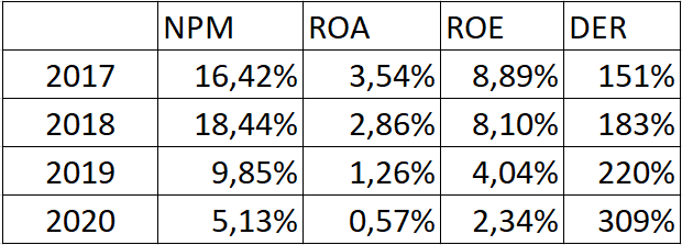 Di sisi lain rasio utang per ekuitas (DER) emiten menguat menjadi 309 persen di tahun 2020, padahal di tahun 2017 masih berada di 151 persen saja.