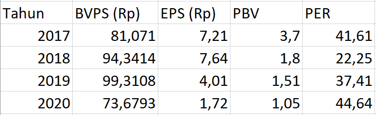 Di sisi lain laba per saham (EPS) juga turun ke Rp1,72, di harga Rp77 per saham maka PER nya saat ini adalah 44,64x. Secara valuasi nilai ini cukup mahal dan kurang menarik.
