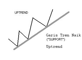 Kita mengantisipasi perubahan arah trend maka garis trend naik di gambar setelah ada dua lembah atau lebih yang meninggi. Garis Uptrend tersebut akan berfungsi sebagai garis Support.