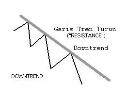 Garis Downtrend harus digambar di puncak-puncak yang merendah. Dengan begitu garis tersebut akan berfungsi sebagai Resistance. Garis ini akan mengantisipasi perubahan arah trend jika kandil-kandil memutuskan untuk berbalik arah menjadi Uptrend.
