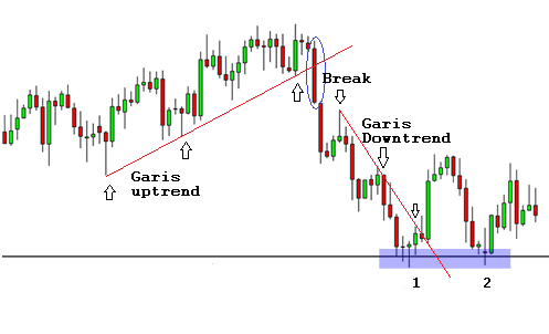 Kita juga bisa memanfaatkan garis trend untuk melihat apakah harga break/menembus dan kemudian membentuk trend yang berbeda.