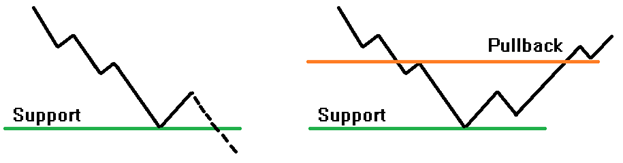 Ada pun cara masuk yang lebih konservatif yang lebih sedikit risikonya, yaitu dengan menunggu pullback setelah Bounce. Ini akan mengingatkanmu tentang materi Price Action yang lalu.