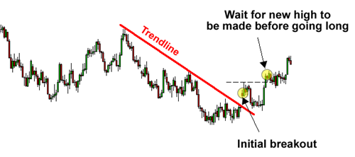 Break pada garis Resistance yang dibentuk dari garis trend menandakan perubahan arah trend. Tunggu hingga muncul konfirmasi sebelum masuk posisi. Konfirmasi maksudnya adalah tanda dari Higher High yang mengindikasikan Uptrend.