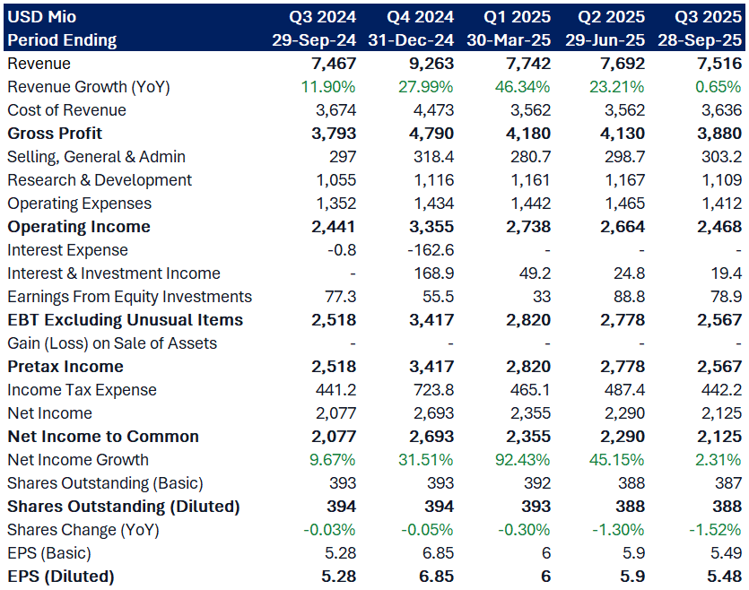 - ASML diperkirakan akan merilis laporan keuangan kuartal yang berakhir pada Desember 2025 pada 28 Januari 2026 sebelum pembukaan pasar, dengan ekspektasi pertumbuhan laba yang tetap solid. Konsensus proyeksi dari 3 analis memperkirakan laba per saham mencapai US$ 8.84, meningkat dibandingkan realisasi pada periode yang sama tahun sebelumnya sebesar US$ 7.30. Kenaikan proyeksi ini mencerminkan kuatnya permintaan berkelanjutan terhadap mesin litografi canggih ASML, khususnya di tengah investasi besar industri semikonduktor pada teknologi manufaktur generasi lanjut, sehingga kinerja kuartalan ini akan menjadi indikator penting bagi investor untuk menilai momentum pemulihan belanja modal chip global menuju 2026.