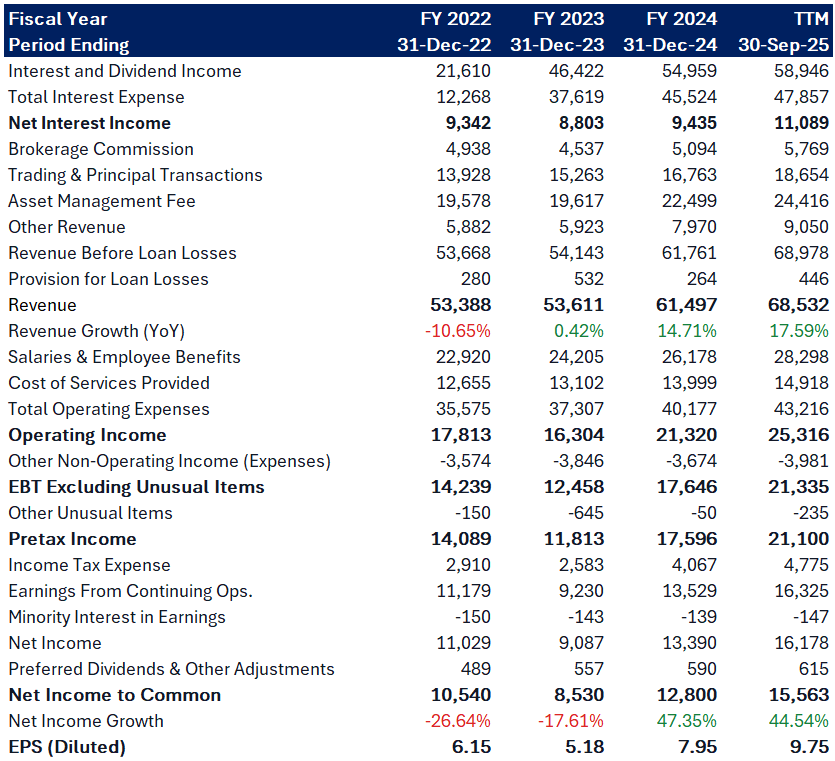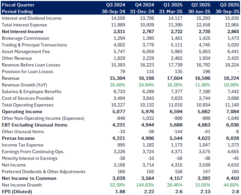 - Morgan Stanley diperkirakan akan merilis laporan keuangan kuartal yang berakhir pada Desember 2025 pada 15 Januari 2026 sebelum pembukaan pasar, dengan perhatian investor tertuju pada potensi kelanjutan pertumbuhan laba. Konsensus proyeksi dari 6 analis memperkirakan laba per saham berada di level US$ 2.32, sedikit lebih tinggi dibandingkan realisasi pada periode yang sama tahun sebelumnya sebesar US$ 2.22. Proyeksi kenaikan ini mencerminkan ekspektasi pasar terhadap stabilnya kinerja bisnis perbankan investasi dan manajemen kekayaan Morgan Stanley di tengah kondisi pasar keuangan yang masih dinamis menjelang awal 2026.