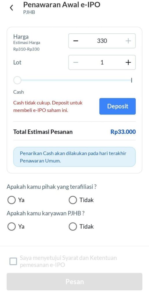 Setelah melihat data dan informasi, serta baca prospektus mengenai saham IPO PJHB, tentukan jumlah lot pemesanan yang diinginkan. Jangan lupa untuk mencentang pernyataan persetujuan (Syarat dan Ketentuan).