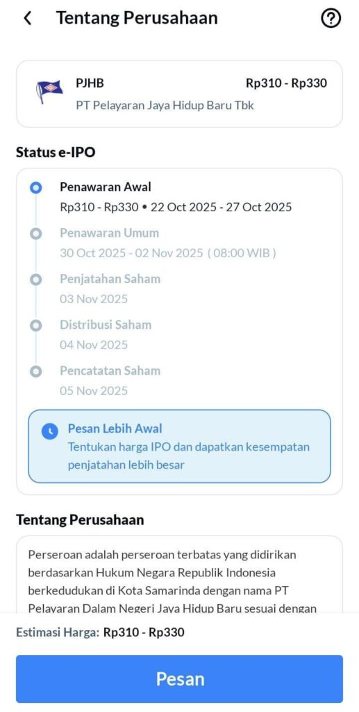 Apabila detail pembelian sudah sesuai, tekan “Pesan” untuk menyelesaikan pemesanan beli saham IPO PJHB.