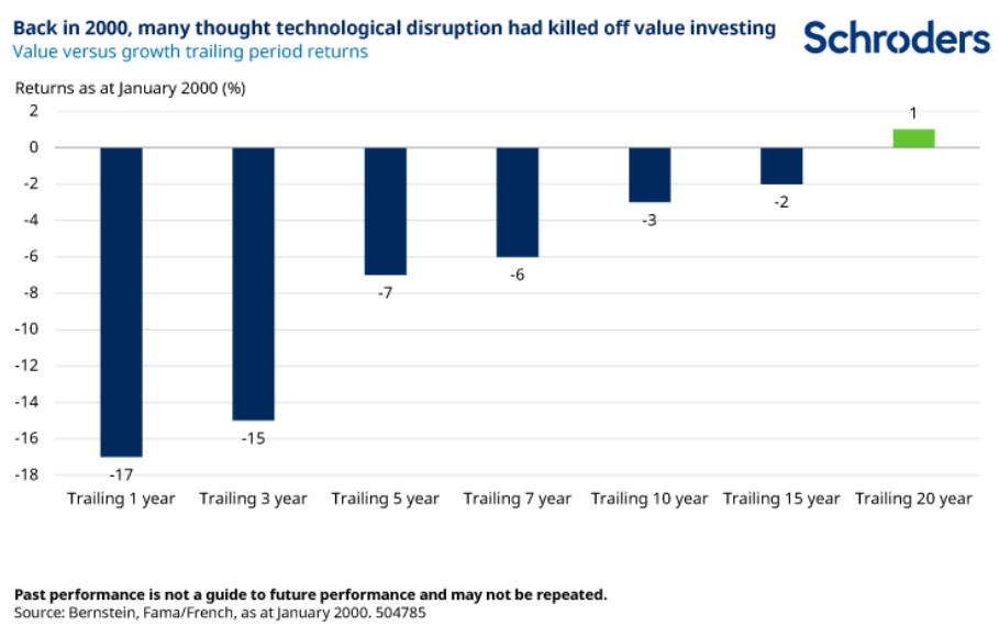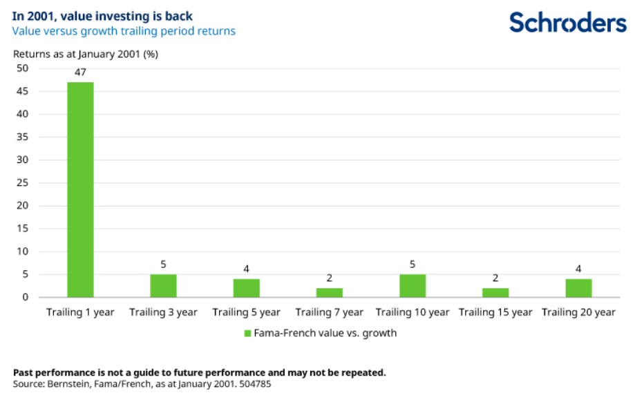 Namun mereka yang melihat ‘value’ justru memanfaatkannya untuk berani membeli saham IBM dan Google, dan semua yang punya ‘value’ pada kinerjanya dan cukup murah saat itu. Schroders telah mengutip data Bernstein yang melakukan pendataan dengan sangat baik tentang hal ini.