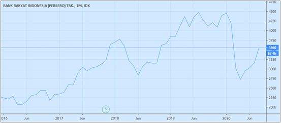 Ada empat jenis harga saham secara historis, yakni harga pembukaan (open), harga terendah (low), harga tertinggi (high), dan harga penutupan (close). Umpama kamu memilih line chart berbasis harga penutupan saham BBRI pada rentang bulanan, maka perangkat charting akan menampilkan garis yang ditarik dari harga penutupan setiap bulan seperti tampak di bawah ini.