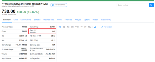 Jika kamu tidak mau repot menghitung Beta secara manual, jangan khawatir karena kini informasi mengenai Beta setiap saham bisa didapat secara otomatis seperti di situs Yahoo Finance seperti ini.