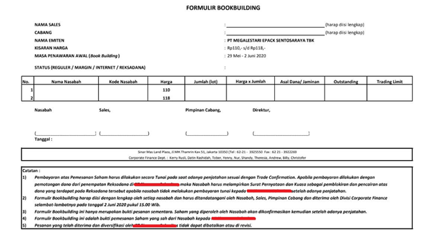 - Pemesanan pada tahap ini biasanya hanya tersedia melalui sekuritas yang bertindak sebagai underwriter (penjamin emisi) atau yang memiliki kerjasama dengan underwriter IPO tersebut.