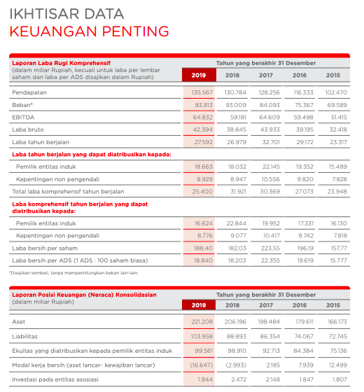 Lalu untuk mencari tahu bagaimana kinerja Telkom Indonesia selama beberapa tahun kebelakang, kunjungi saja laman Ikhtisar Data Penting Keuangan. Laman ini berisi ringkasan laporan laba rugi, posisi neraca dan rasio keuangan