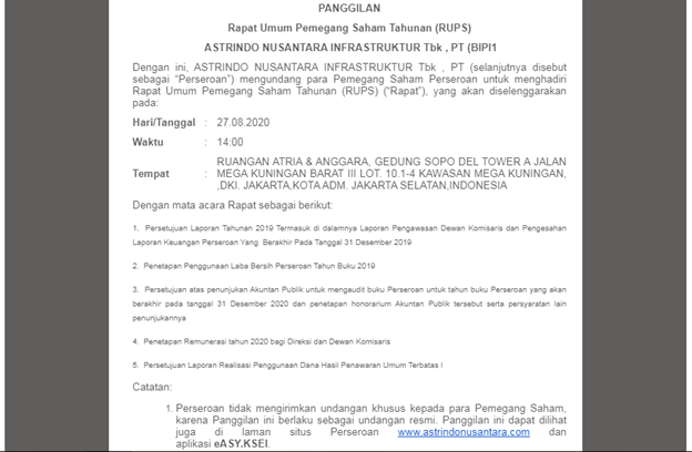 Kamu akan mendapat panggilan, bukan undangan, untuk menghadiri RUPS dari KSEI. Rupanya emiten BIPI hendak mengadakan RUPS tahunan dan RUPS Luar Biasa untuk meminta izin kepada para pemegang sahamnya terkait suatu hal. Berikut keterangannya;