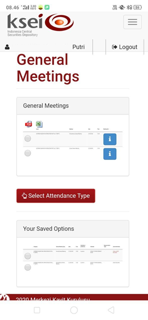 Kamu akan dapat memasukkan informasi bahwakamu akan hadir dalam RUPS dengan mengklik pilihan kehadiran seperti di bawah ini: