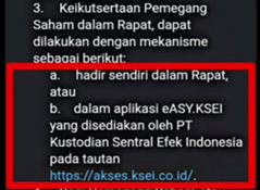 Dalam catatan nomor tiga kita diberi pilihan untuk a. Hadir di rapat secara langsung; b. hadir dalam aplikasi eASY KSEI yang disediakan oleh PT. KSEI di https://akses.ksei.co.id/