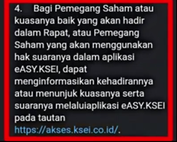 Opsi B menarik bagi Putri yang tidak bisa datang secara fisik karena daerahnya ditandai sebagai zona hitam Covid-19. Sejauh ini ternyata sudah ada selusin emiten yang menyelenggarakan RUPS nya secara online atau istilahnya e-RUPS. Selanjutnya di catatan nomor empat terdapat instruksi untuk hadir secara online melalui aplikasi eASY.KSEI;