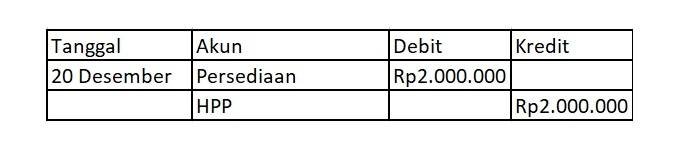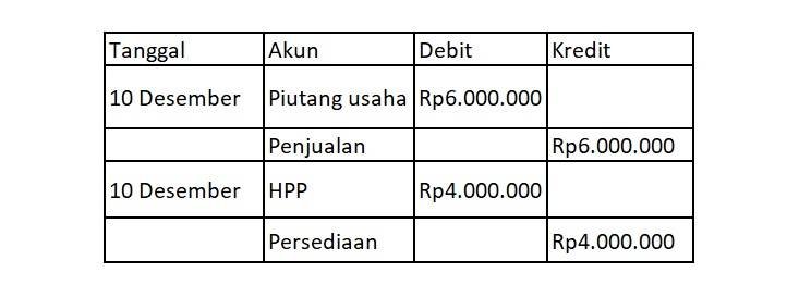Pencatatan yang kedua adalah akun HPP yang berada di posisi debit terhadap pengkreditan persediaan. Hal ini bertujuan agar perusahaan bisa mendapatkan profit maupun laba. Salah satu contohnya adalah pada tanggal 10 Desember PT Kilau Mengkilau melakukan penjualan dari barang persediaan secara kredit dengan total penjualan mencapai Rp6.000.000.