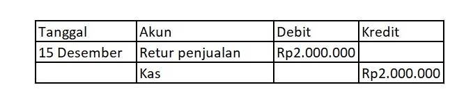 Sementara di tanggal 15 Desember, pelanggan mengembalikan barang yang dibeli karena rusak dan tidak bisa dijual sebesar Rp2.000.000, maka catatannya seperti berikut: