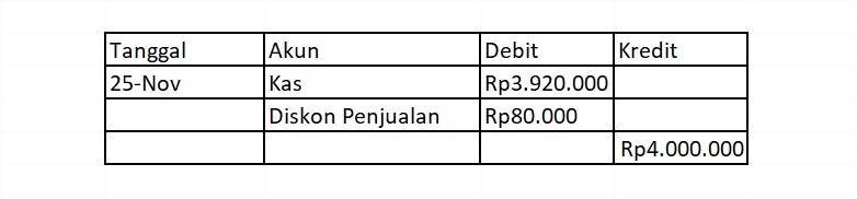 Hal yang satu ini bisa dipahami dengan contoh suatu perusahaan melakukan penjualan barang secara kredit di tanggal 25 November dengan syarat 2/10, n/30, serta pelunasan yang dilakukan pelanggan sesuai dengan persyaratan. Hal ini berarti perusahaan akan memberikan diskon kepada pelanggan jika pelunasan dari piutang di hari kesembilan atau kurang dari sepuluh hari. Dengan begitu, perhitungan dari diskon dan jurnal tersebut adalah Rp4.000.000 x 2% = Rp80.000.