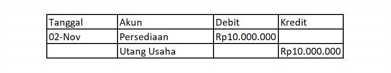 Hal ini bisa dilihat dari contoh pembelian persediaan dengan posisi akun persediaan didebit. Namun, posisi kredit akun berupa kas maupun utang usaha sesuai perjanjian transaksi yang dilakukan. Misalnya, di tanggal 02 November PT Kilau Mengkilau membeli persediaan mencapai Rp 10.000.000 menggunakan termin pembayaran yaitu 2/10, n/30, maka pencatatan jurnal pembelian persediaan seperti berikut: