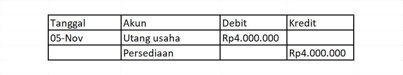 Di tanggal 05 November PT Kilau Mengkilau memiliki beberapa persediaan rusak saat membeli barang dengan nilai sebesar Rp4.000.000, maka perusahaan bisa mengembalikan pembelian tersebut dengan nota yang dimiliki. Maka jurnal retur pembelian yaitu: