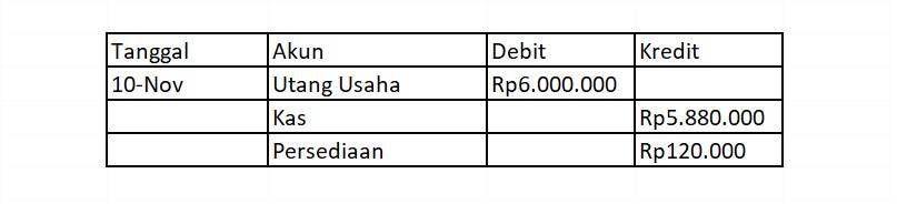 Di tanggal 10 November PT Kilau Mengkilau melunasi pembelian kredit persediaan di pembahasan ketiga di atas. Akan tetapi, ada pengembalian barang persediaan di pembahasan keempat, dengan begitu pembayaran yang dilunasi sebesar Rp6.000.000. Lalu, perusahaan melunasi pembelian persediaan pada hari ke delapan dengan potongan diskon berikut: