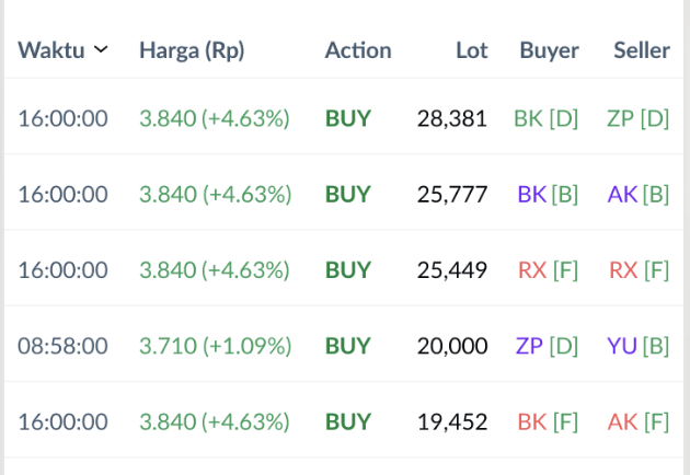 - Ada pembelian besar pada harga 3.840 (+4.63%) dengan lot signifikan di jam 16:00:00 oleh broker BK, RX, dan AK.