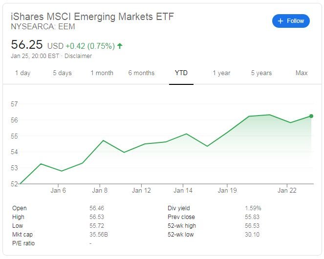 ETF iShares MSCI Emerging Markets yang berisikan aset-aset keuangan pasar negara berkembang telah terapresiasi sebanyak 8% sejak awal tahun, diduga kuat berkat kemenangan Biden meraih kursi nomor satu Amerika dan kebijakan yang dibawanya.