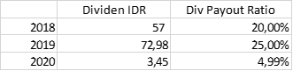 Secara dividen, emiten rutin membagikan dividen setiap tahunnya. Sayangnya, dividen berhenti dibagikan sejak 2021 hingga saat ini.