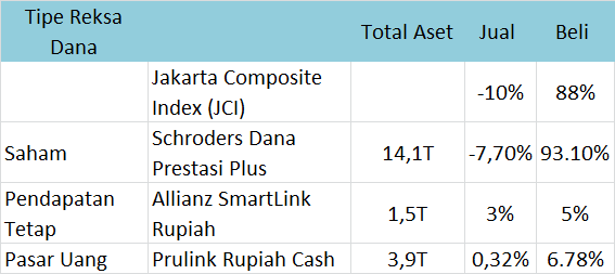 Dalam kolom “Jual” pada tabel tersebut, terlihat kamu akan mengalami kerugian sebesar 7,7% jika yang dijual adalah reksa dana jenis Saham, untung 3% untuk reksa dana Pendapatan Tetap, dan untung 0,32% untuk reksa dana Pasar Uang.