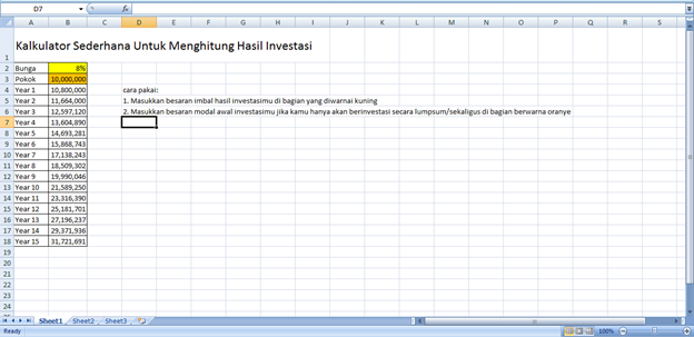 Kamu cukup ganti isian di bagian yang berwarna kuning dan oranye sesuai cara pakainya. Setelah bunga dan modal pokoknya dimasukkan maka hasilnya akan keluar secara otomatis dan kamu akan langsung mengetahui kapan modal kamu menjadi dua atau tiga kali lipatnya.