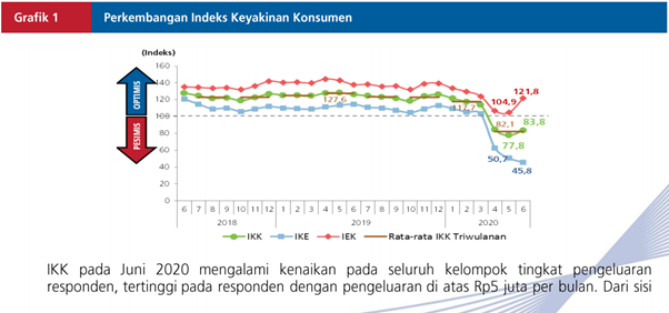Ajaib.co.id – Bank Indonesia (BI) melakukan survei optimisme konsumen terhadap kondisi ekonomi pada bulan Juni 2020. Hasilnya, Indeks Keyakinan Konsumen (IKK) pada Juni 2020 mengalami kenaikan menjadi 83,8, naik dari posisi Mei 2020 pada level 77,8.