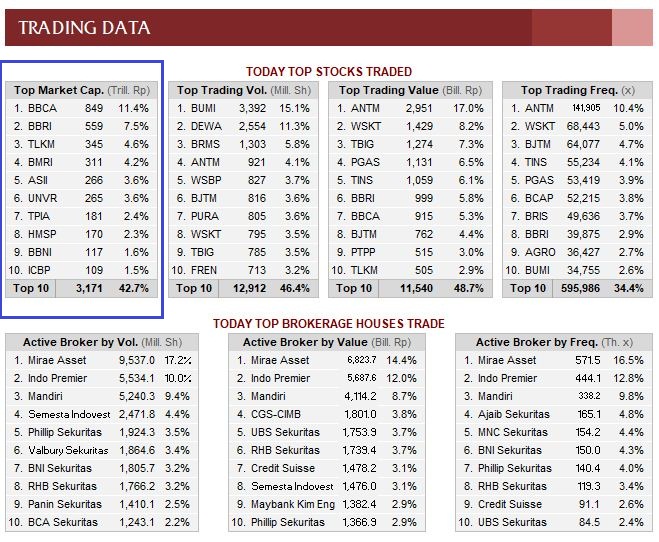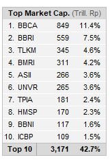 Lihat kolom paling kanan; total marcap seluruh saham yang terdaftar di BEI adalah sebanyak Rp7430 triliun. Nah, total 10 saham ber-marcap terbesar ternyata membentuk 42,7% dari total marcap.