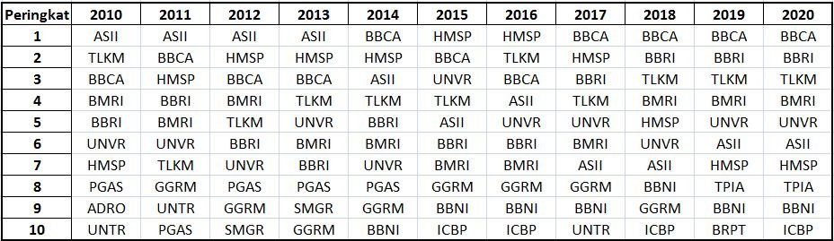 Kamu bisa lihat bahwa selama satu dekade terakhir daftar 10 marcap terbesar dihuni secara konsisten oleh tujuh perusahaan yaitu PT Astra International Tbk (ASII), PT Telkom Indonesia (TLKM), PT Bank Central Asia Tbk (BBCA), PT Bank Mandiri Tbk (BMRI), PT Bank Rakyat Indonesia (BBRI), PT Unilever Indonesia Tbk (UNVR) dan PT HM Sampoerna Tbk (HMSP).