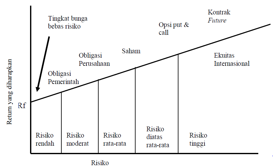 Investasi yang dipandang paling aman dan hampir tidak ada risiko (risk free) ialah obligasi pemerintah karena pokok dan bunganya dijamin oleh undang-undang. Untuk obligasi perusahaan, risikonya dianggap moderat dan berinvestasi saham dinggap memiliki risiko di atas rata-rata, dan kontrak futures dianggap memiliki risiko tinggi.